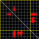 This matrix displays the maximum distance fluctuations between all pairs of CA atoms and between the two extreme conformations that were computed for this mode (DQMIN/DQMAX). Distance increases are plotted in blue and decreases in red for the strongest 10% of the residue pair distance changes. Every pixel corresponds to a single residue. Grey lines are drawn every 10 residues, yellow lines every 100 residues (counting from the upper left corner).