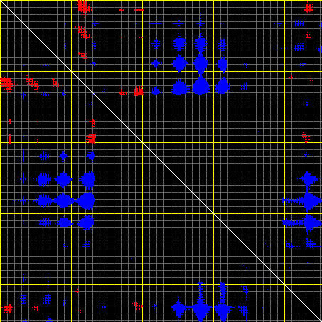 This matrix displays the maximum distance fluctuations between all pairs of CA atoms and between the two extreme conformations that were computed for this mode (DQMIN/DQMAX). Distance increases are plotted in blue and decreases in red for the strongest 10% of the residue pair distance changes. Every pixel corresponds to a single residue. Grey lines are drawn every 10 residues, yellow lines every 100 residues (counting from the upper left corner).