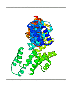 These views are prepared from three orthologuous viewpoints with MolScript. Secondary structures are determined from the C-alpha atom positions of your protein (N-terminal blue, C-terminal red).