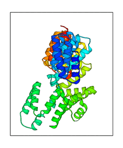 These views are prepared from three orthologuous viewpoints with MolScript. Secondary structures are determined from the C-alpha atom positions of your protein (N-terminal blue, C-terminal red).