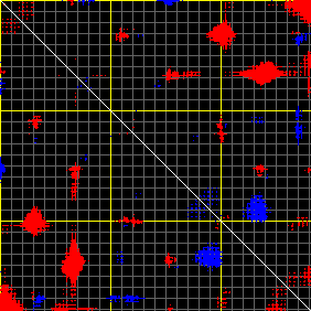 This matrix displays the maximum distance fluctuations between all pairs of CA atoms and between the two extreme conformations that were computed for this mode (DQMIN/DQMAX). Distance increases are plotted in blue and decreases in red for the strongest 10% of the residue pair distance changes. Every pixel corresponds to a single residue. Grey lines are drawn every 10 residues, yellow lines every 100 residues (counting from the upper left corner).