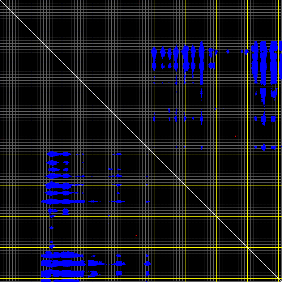 This matrix displays the maximum distance fluctuations between all pairs of CA atoms and between the two extreme conformations that were computed for this mode (DQMIN/DQMAX). Distance increases are plotted in blue and decreases in red for the strongest 10% of the residue pair distance changes. Every pixel corresponds to a single residue. Grey lines are drawn every 10 residues, yellow lines every 100 residues (counting from the upper left corner).