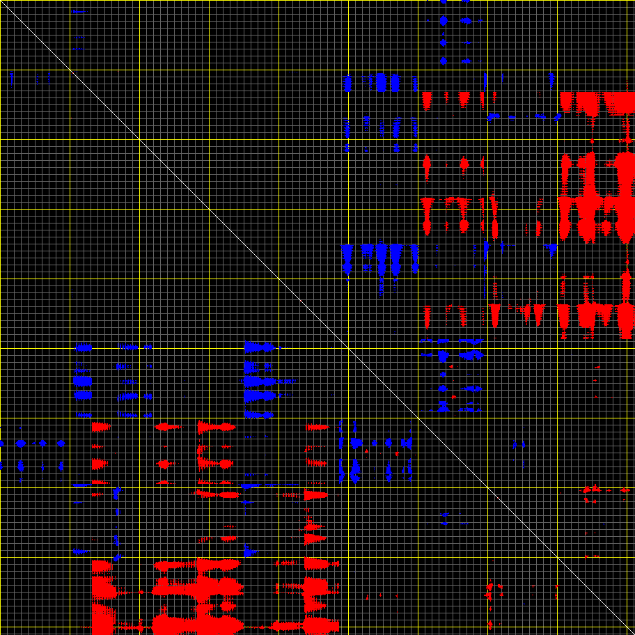 This matrix displays the maximum distance fluctuations between all pairs of CA atoms and between the two extreme conformations that were computed for this mode (DQMIN/DQMAX). Distance increases are plotted in blue and decreases in red for the strongest 10% of the residue pair distance changes. Every pixel corresponds to a single residue. Grey lines are drawn every 10 residues, yellow lines every 100 residues (counting from the upper left corner).