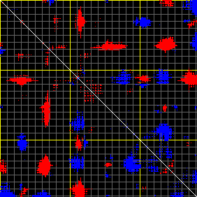 This matrix displays the maximum distance fluctuations between all pairs of CA atoms and between the two extreme conformations that were computed for this mode (DQMIN/DQMAX). Distance increases are plotted in blue and decreases in red for the strongest 10% of the residue pair distance changes. Every pixel corresponds to a single residue. Grey lines are drawn every 10 residues, yellow lines every 100 residues (counting from the upper left corner).