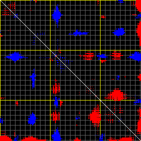 This matrix displays the maximum distance fluctuations between all pairs of CA atoms and between the two extreme conformations that were computed for this mode (DQMIN/DQMAX). Distance increases are plotted in blue and decreases in red for the strongest 10% of the residue pair distance changes. Every pixel corresponds to a single residue. Grey lines are drawn every 10 residues, yellow lines every 100 residues (counting from the upper left corner).