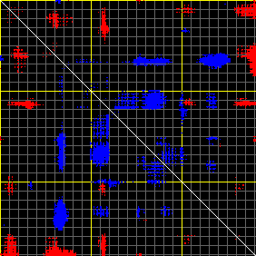 This matrix displays the maximum distance fluctuations between all pairs of CA atoms and between the two extreme conformations that were computed for this mode (DQMIN/DQMAX). Distance increases are plotted in blue and decreases in red for the strongest 10% of the residue pair distance changes. Every pixel corresponds to a single residue. Grey lines are drawn every 10 residues, yellow lines every 100 residues (counting from the upper left corner).