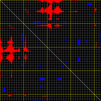 This matrix displays the maximum distance fluctuations between all pairs of CA atoms and between the two extreme conformations that were computed for this mode (DQMIN/DQMAX). Distance increases are plotted in blue and decreases in red for the strongest 10% of the residue pair distance changes. Every pixel corresponds to a single residue. Grey lines are drawn every 10 residues, yellow lines every 100 residues (counting from the upper left corner).