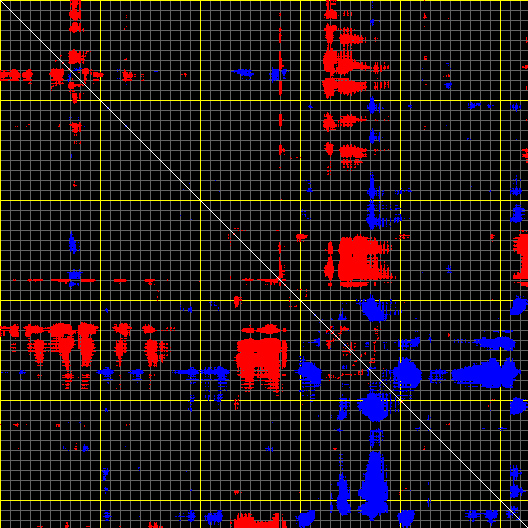 This matrix displays the maximum distance fluctuations between all pairs of CA atoms and between the two extreme conformations that were computed for this mode (DQMIN/DQMAX). Distance increases are plotted in blue and decreases in red for the strongest 10% of the residue pair distance changes. Every pixel corresponds to a single residue. Grey lines are drawn every 10 residues, yellow lines every 100 residues (counting from the upper left corner).