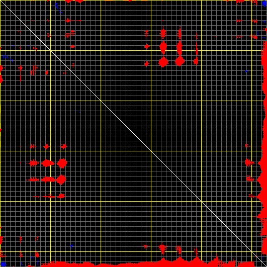 This matrix displays the maximum distance fluctuations between all pairs of CA atoms and between the two extreme conformations that were computed for this mode (DQMIN/DQMAX). Distance increases are plotted in blue and decreases in red for the strongest 10% of the residue pair distance changes. Every pixel corresponds to a single residue. Grey lines are drawn every 10 residues, yellow lines every 100 residues (counting from the upper left corner).