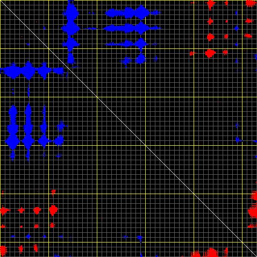 This matrix displays the maximum distance fluctuations between all pairs of CA atoms and between the two extreme conformations that were computed for this mode (DQMIN/DQMAX). Distance increases are plotted in blue and decreases in red for the strongest 10% of the residue pair distance changes. Every pixel corresponds to a single residue. Grey lines are drawn every 10 residues, yellow lines every 100 residues (counting from the upper left corner).