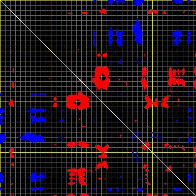 This matrix displays the maximum distance fluctuations between all pairs of CA atoms and between the two extreme conformations that were computed for this mode (DQMIN/DQMAX). Distance increases are plotted in blue and decreases in red for the strongest 10% of the residue pair distance changes. Every pixel corresponds to a single residue. Grey lines are drawn every 10 residues, yellow lines every 100 residues (counting from the upper left corner).