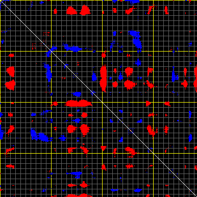 This matrix displays the maximum distance fluctuations between all pairs of CA atoms and between the two extreme conformations that were computed for this mode (DQMIN/DQMAX). Distance increases are plotted in blue and decreases in red for the strongest 10% of the residue pair distance changes. Every pixel corresponds to a single residue. Grey lines are drawn every 10 residues, yellow lines every 100 residues (counting from the upper left corner).