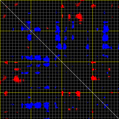 This matrix displays the maximum distance fluctuations between all pairs of CA atoms and between the two extreme conformations that were computed for this mode (DQMIN/DQMAX). Distance increases are plotted in blue and decreases in red for the strongest 10% of the residue pair distance changes. Every pixel corresponds to a single residue. Grey lines are drawn every 10 residues, yellow lines every 100 residues (counting from the upper left corner).