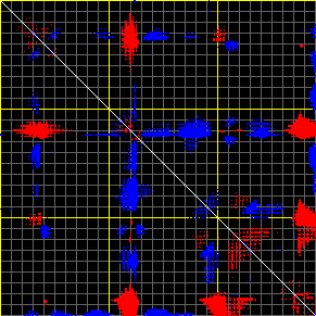 This matrix displays the maximum distance fluctuations between all pairs of CA atoms and between the two extreme conformations that were computed for this mode (DQMIN/DQMAX). Distance increases are plotted in blue and decreases in red for the strongest 10% of the residue pair distance changes. Every pixel corresponds to a single residue. Grey lines are drawn every 10 residues, yellow lines every 100 residues (counting from the upper left corner).
