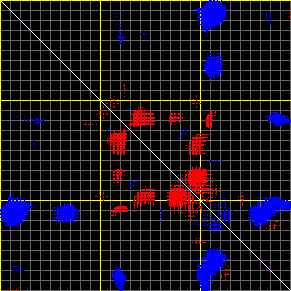 This matrix displays the maximum distance fluctuations between all pairs of CA atoms and between the two extreme conformations that were computed for this mode (DQMIN/DQMAX). Distance increases are plotted in blue and decreases in red for the strongest 10% of the residue pair distance changes. Every pixel corresponds to a single residue. Grey lines are drawn every 10 residues, yellow lines every 100 residues (counting from the upper left corner).