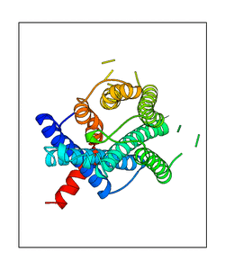 These views are prepared from three orthologuous viewpoints with MolScript. Secondary structures are determined from the C-alpha atom positions of your protein (N-terminal blue, C-terminal red).