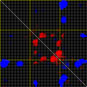 This matrix displays the maximum distance fluctuations between all pairs of CA atoms and between the two extreme conformations that were computed for this mode (DQMIN/DQMAX). Distance increases are plotted in blue and decreases in red for the strongest 10% of the residue pair distance changes. Every pixel corresponds to a single residue. Grey lines are drawn every 10 residues, yellow lines every 100 residues (counting from the upper left corner).