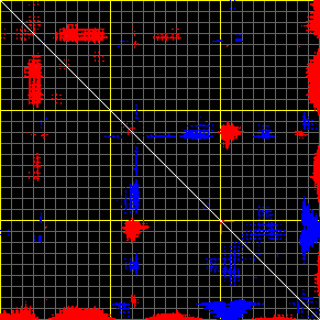 This matrix displays the maximum distance fluctuations between all pairs of CA atoms and between the two extreme conformations that were computed for this mode (DQMIN/DQMAX). Distance increases are plotted in blue and decreases in red for the strongest 10% of the residue pair distance changes. Every pixel corresponds to a single residue. Grey lines are drawn every 10 residues, yellow lines every 100 residues (counting from the upper left corner).