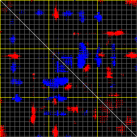 This matrix displays the maximum distance fluctuations between all pairs of CA atoms and between the two extreme conformations that were computed for this mode (DQMIN/DQMAX). Distance increases are plotted in blue and decreases in red for the strongest 10% of the residue pair distance changes. Every pixel corresponds to a single residue. Grey lines are drawn every 10 residues, yellow lines every 100 residues (counting from the upper left corner).