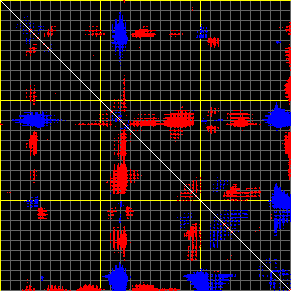 This matrix displays the maximum distance fluctuations between all pairs of CA atoms and between the two extreme conformations that were computed for this mode (DQMIN/DQMAX). Distance increases are plotted in blue and decreases in red for the strongest 10% of the residue pair distance changes. Every pixel corresponds to a single residue. Grey lines are drawn every 10 residues, yellow lines every 100 residues (counting from the upper left corner).