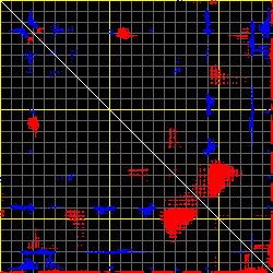 This matrix displays the maximum distance fluctuations between all pairs of CA atoms and between the two extreme conformations that were computed for this mode (DQMIN/DQMAX). Distance increases are plotted in blue and decreases in red for the strongest 10% of the residue pair distance changes. Every pixel corresponds to a single residue. Grey lines are drawn every 10 residues, yellow lines every 100 residues (counting from the upper left corner).