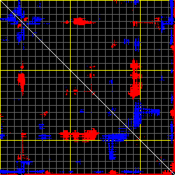 This matrix displays the maximum distance fluctuations between all pairs of CA atoms and between the two extreme conformations that were computed for this mode (DQMIN/DQMAX). Distance increases are plotted in blue and decreases in red for the strongest 10% of the residue pair distance changes. Every pixel corresponds to a single residue. Grey lines are drawn every 10 residues, yellow lines every 100 residues (counting from the upper left corner).