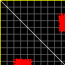 This matrix displays the maximum distance fluctuations between all pairs of CA atoms and between the two extreme conformations that were computed for this mode (DQMIN/DQMAX). Distance increases are plotted in blue and decreases in red for the strongest 10% of the residue pair distance changes. Every pixel corresponds to a single residue. Grey lines are drawn every 10 residues, yellow lines every 100 residues (counting from the upper left corner).