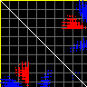 This matrix displays the maximum distance fluctuations between all pairs of CA atoms and between the two extreme conformations that were computed for this mode (DQMIN/DQMAX). Distance increases are plotted in blue and decreases in red for the strongest 10% of the residue pair distance changes. Every pixel corresponds to a single residue. Grey lines are drawn every 10 residues, yellow lines every 100 residues (counting from the upper left corner).