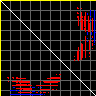 This matrix displays the maximum distance fluctuations between all pairs of CA atoms and between the two extreme conformations that were computed for this mode (DQMIN/DQMAX). Distance increases are plotted in blue and decreases in red for the strongest 10% of the residue pair distance changes. Every pixel corresponds to a single residue. Grey lines are drawn every 10 residues, yellow lines every 100 residues (counting from the upper left corner).