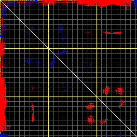 This matrix displays the maximum distance fluctuations between all pairs of CA atoms and between the two extreme conformations that were computed for this mode (DQMIN/DQMAX). Distance increases are plotted in blue and decreases in red for the strongest 10% of the residue pair distance changes. Every pixel corresponds to a single residue. Grey lines are drawn every 10 residues, yellow lines every 100 residues (counting from the upper left corner).