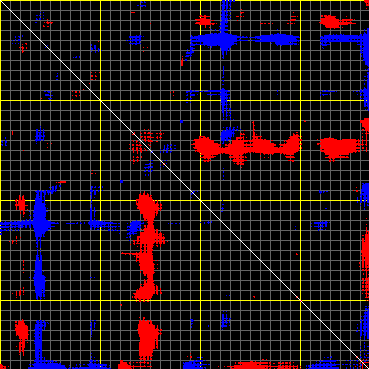 This matrix displays the maximum distance fluctuations between all pairs of CA atoms and between the two extreme conformations that were computed for this mode (DQMIN/DQMAX). Distance increases are plotted in blue and decreases in red for the strongest 10% of the residue pair distance changes. Every pixel corresponds to a single residue. Grey lines are drawn every 10 residues, yellow lines every 100 residues (counting from the upper left corner).