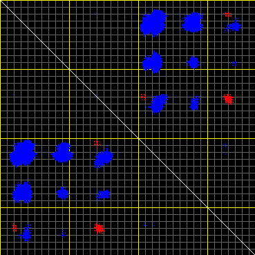 This matrix displays the maximum distance fluctuations between all pairs of CA atoms and between the two extreme conformations that were computed for this mode (DQMIN/DQMAX). Distance increases are plotted in blue and decreases in red for the strongest 10% of the residue pair distance changes. Every pixel corresponds to a single residue. Grey lines are drawn every 10 residues, yellow lines every 100 residues (counting from the upper left corner).