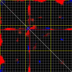 This matrix displays the maximum distance fluctuations between all pairs of CA atoms and between the two extreme conformations that were computed for this mode (DQMIN/DQMAX). Distance increases are plotted in blue and decreases in red for the strongest 10% of the residue pair distance changes. Every pixel corresponds to a single residue. Grey lines are drawn every 10 residues, yellow lines every 100 residues (counting from the upper left corner).