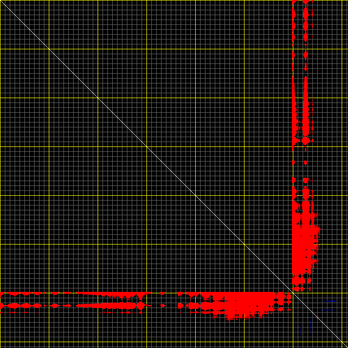 This matrix displays the maximum distance fluctuations between all pairs of CA atoms and between the two extreme conformations that were computed for this mode (DQMIN/DQMAX). Distance increases are plotted in blue and decreases in red for the strongest 10% of the residue pair distance changes. Every pixel corresponds to a single residue. Grey lines are drawn every 10 residues, yellow lines every 100 residues (counting from the upper left corner).