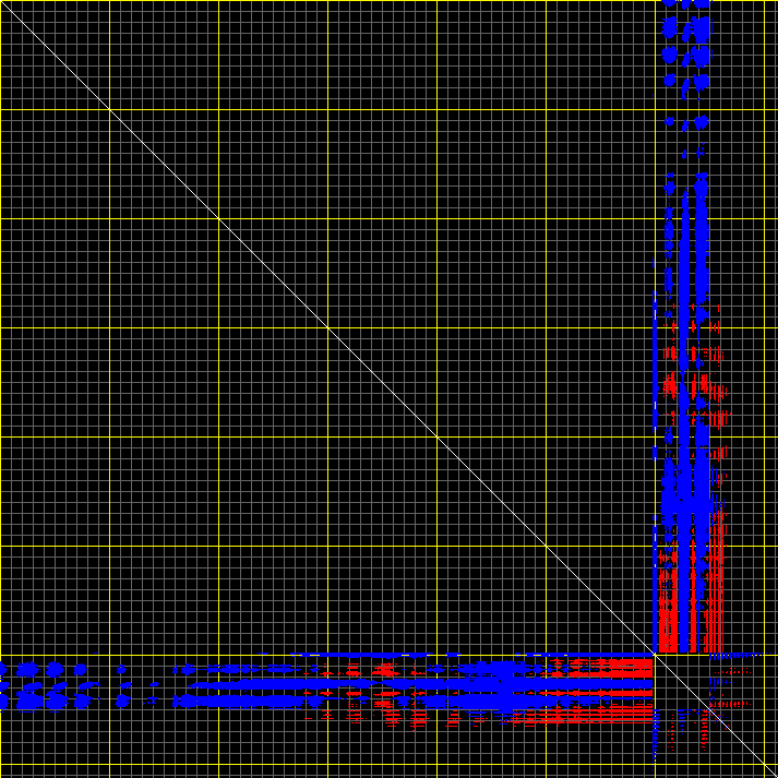 This matrix displays the maximum distance fluctuations between all pairs of CA atoms and between the two extreme conformations that were computed for this mode (DQMIN/DQMAX). Distance increases are plotted in blue and decreases in red for the strongest 10% of the residue pair distance changes. Every pixel corresponds to a single residue. Grey lines are drawn every 10 residues, yellow lines every 100 residues (counting from the upper left corner).