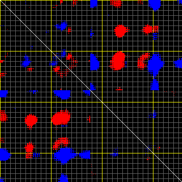 This matrix displays the maximum distance fluctuations between all pairs of CA atoms and between the two extreme conformations that were computed for this mode (DQMIN/DQMAX). Distance increases are plotted in blue and decreases in red for the strongest 10% of the residue pair distance changes. Every pixel corresponds to a single residue. Grey lines are drawn every 10 residues, yellow lines every 100 residues (counting from the upper left corner).