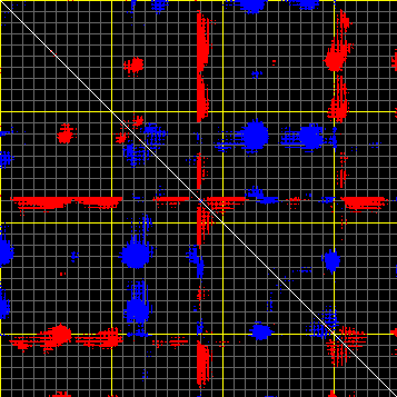 This matrix displays the maximum distance fluctuations between all pairs of CA atoms and between the two extreme conformations that were computed for this mode (DQMIN/DQMAX). Distance increases are plotted in blue and decreases in red for the strongest 10% of the residue pair distance changes. Every pixel corresponds to a single residue. Grey lines are drawn every 10 residues, yellow lines every 100 residues (counting from the upper left corner).