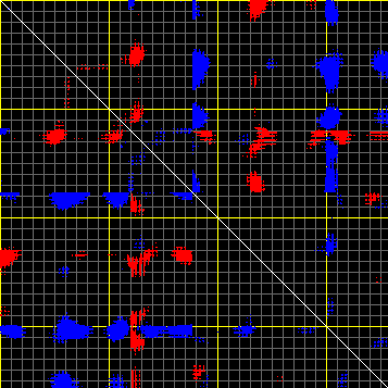 This matrix displays the maximum distance fluctuations between all pairs of CA atoms and between the two extreme conformations that were computed for this mode (DQMIN/DQMAX). Distance increases are plotted in blue and decreases in red for the strongest 10% of the residue pair distance changes. Every pixel corresponds to a single residue. Grey lines are drawn every 10 residues, yellow lines every 100 residues (counting from the upper left corner).