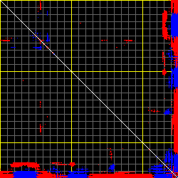 This matrix displays the maximum distance fluctuations between all pairs of CA atoms and between the two extreme conformations that were computed for this mode (DQMIN/DQMAX). Distance increases are plotted in blue and decreases in red for the strongest 10% of the residue pair distance changes. Every pixel corresponds to a single residue. Grey lines are drawn every 10 residues, yellow lines every 100 residues (counting from the upper left corner).