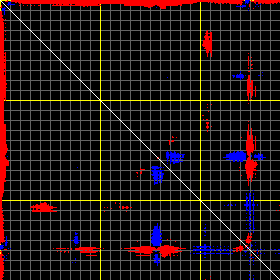 This matrix displays the maximum distance fluctuations between all pairs of CA atoms and between the two extreme conformations that were computed for this mode (DQMIN/DQMAX). Distance increases are plotted in blue and decreases in red for the strongest 10% of the residue pair distance changes. Every pixel corresponds to a single residue. Grey lines are drawn every 10 residues, yellow lines every 100 residues (counting from the upper left corner).