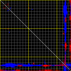 This matrix displays the maximum distance fluctuations between all pairs of CA atoms and between the two extreme conformations that were computed for this mode (DQMIN/DQMAX). Distance increases are plotted in blue and decreases in red for the strongest 10% of the residue pair distance changes. Every pixel corresponds to a single residue. Grey lines are drawn every 10 residues, yellow lines every 100 residues (counting from the upper left corner).