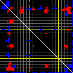 This matrix displays the maximum distance fluctuations between all pairs of CA atoms and between the two extreme conformations that were computed for this mode (DQMIN/DQMAX). Distance increases are plotted in blue and decreases in red for the strongest 10% of the residue pair distance changes. Every pixel corresponds to a single residue. Grey lines are drawn every 10 residues, yellow lines every 100 residues (counting from the upper left corner).