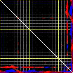 This matrix displays the maximum distance fluctuations between all pairs of CA atoms and between the two extreme conformations that were computed for this mode (DQMIN/DQMAX). Distance increases are plotted in blue and decreases in red for the strongest 10% of the residue pair distance changes. Every pixel corresponds to a single residue. Grey lines are drawn every 10 residues, yellow lines every 100 residues (counting from the upper left corner).