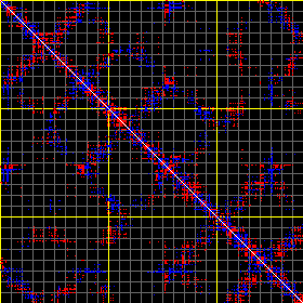 This matrix displays the maximum distance fluctuations between all pairs of CA atoms and between the two extreme conformations that were computed for this mode (DQMIN/DQMAX). Distance increases are plotted in blue and decreases in red for the strongest 10% of the residue pair distance changes. Every pixel corresponds to a single residue. Grey lines are drawn every 10 residues, yellow lines every 100 residues (counting from the upper left corner).