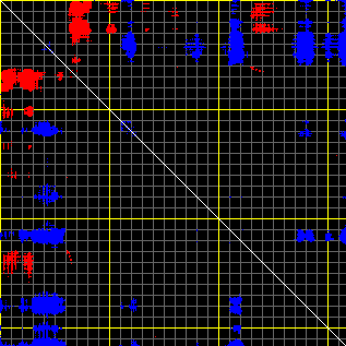 This matrix displays the maximum distance fluctuations between all pairs of CA atoms and between the two extreme conformations that were computed for this mode (DQMIN/DQMAX). Distance increases are plotted in blue and decreases in red for the strongest 10% of the residue pair distance changes. Every pixel corresponds to a single residue. Grey lines are drawn every 10 residues, yellow lines every 100 residues (counting from the upper left corner).