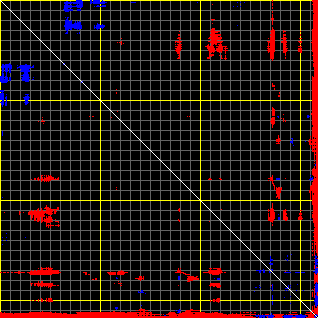This matrix displays the maximum distance fluctuations between all pairs of CA atoms and between the two extreme conformations that were computed for this mode (DQMIN/DQMAX). Distance increases are plotted in blue and decreases in red for the strongest 10% of the residue pair distance changes. Every pixel corresponds to a single residue. Grey lines are drawn every 10 residues, yellow lines every 100 residues (counting from the upper left corner).