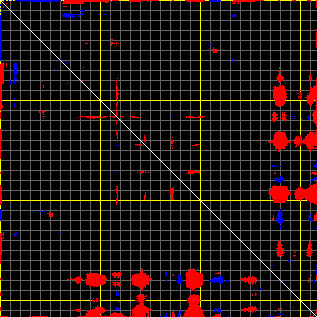 This matrix displays the maximum distance fluctuations between all pairs of CA atoms and between the two extreme conformations that were computed for this mode (DQMIN/DQMAX). Distance increases are plotted in blue and decreases in red for the strongest 10% of the residue pair distance changes. Every pixel corresponds to a single residue. Grey lines are drawn every 10 residues, yellow lines every 100 residues (counting from the upper left corner).