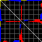 This matrix displays the maximum distance fluctuations between all pairs of CA atoms and between the two extreme conformations that were computed for this mode (DQMIN/DQMAX). Distance increases are plotted in blue and decreases in red for the strongest 10% of the residue pair distance changes. Every pixel corresponds to a single residue. Grey lines are drawn every 10 residues, yellow lines every 100 residues (counting from the upper left corner).