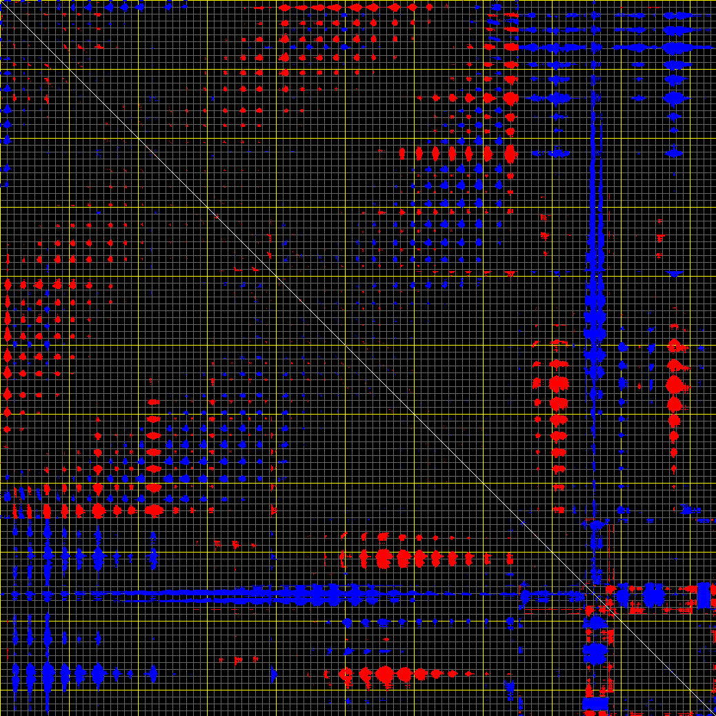 This matrix displays the maximum distance fluctuations between all pairs of CA atoms and between the two extreme conformations that were computed for this mode (DQMIN/DQMAX). Distance increases are plotted in blue and decreases in red for the strongest 10% of the residue pair distance changes. Every pixel corresponds to a single residue. Grey lines are drawn every 10 residues, yellow lines every 100 residues (counting from the upper left corner).