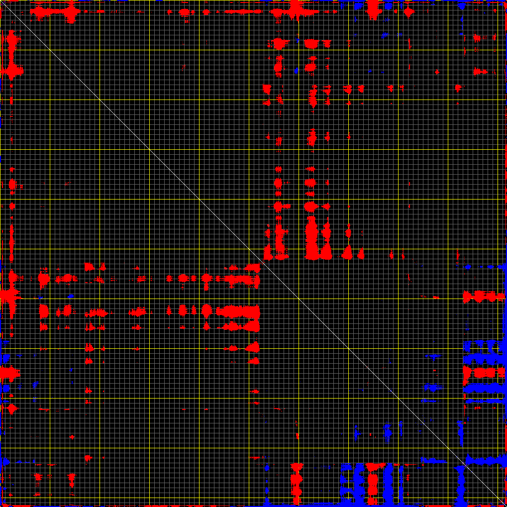 This matrix displays the maximum distance fluctuations between all pairs of CA atoms and between the two extreme conformations that were computed for this mode (DQMIN/DQMAX). Distance increases are plotted in blue and decreases in red for the strongest 10% of the residue pair distance changes. Every pixel corresponds to a single residue. Grey lines are drawn every 10 residues, yellow lines every 100 residues (counting from the upper left corner).